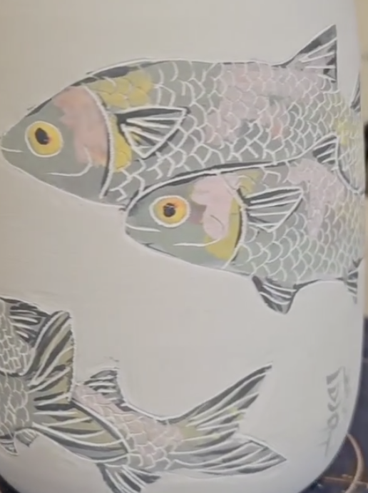 Many pieces also feature surface design by Elizabeth Schowachert, whose sgraffito technique combines painting and fine-line scratching to reveal layers of color and detail beneath the surface. Her approach adds a painterly narrative to Kim’s thrown forms, blending expressive mark-making with the structure and precision of wheel-thrown clay.