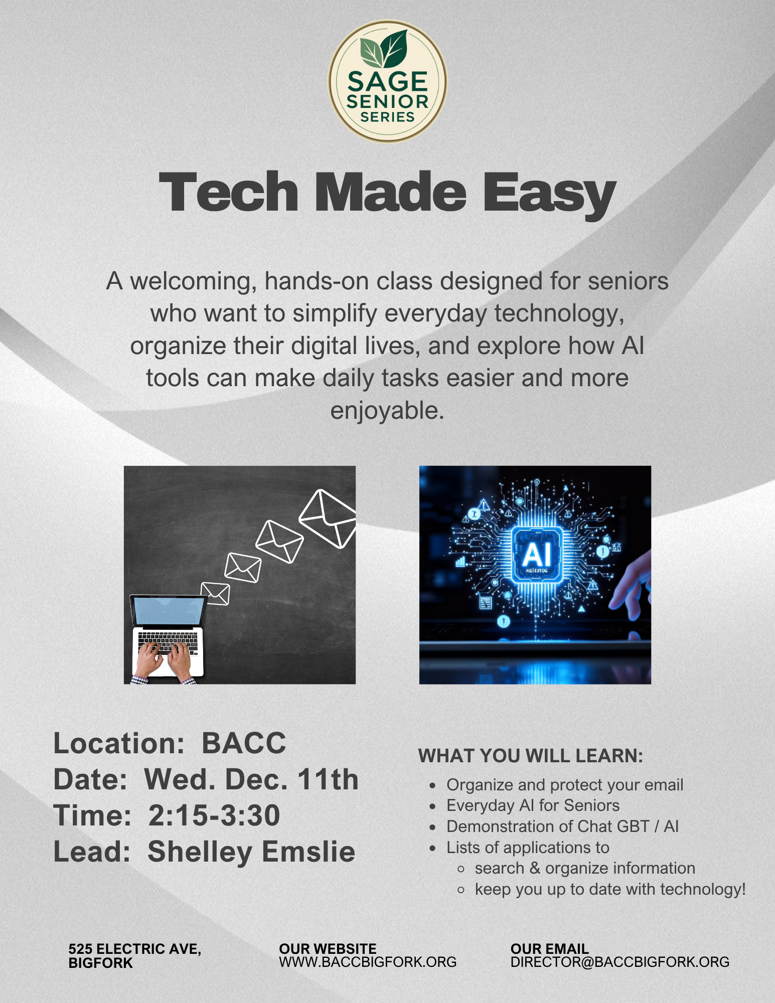 A welcoming, hands-on class designed for seniors who want to simplify everyday technology, organize their digital lives, and explore how AI tools can make daily tasks easier and more enjoyable.